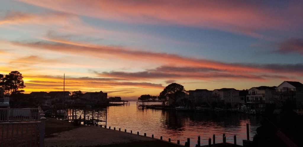 Sunset in Colington Harbour brings all of the boats back into port. Stately masted sailboats and little junkie pontoons all turn away from their day-trippy cruises and head back for the safety of secure slips and backyard docks. The ones who stay longest on the sound until the very last vestige of sunlight has slipped over the horizon have to return by the illumination of their boat’s running lights.