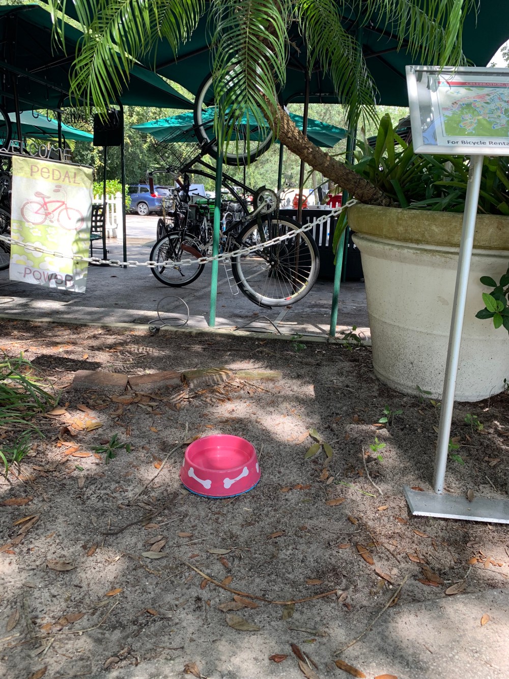 There is a town in central Florida called Celebration that has a charming, old-fashioned downtown area. The businesses that line the streets often have dog water bowls and little baskets filled with dog treats to entice you to stop and look in their windows. You can imagine my dog Georgia’s incredible joy when we discovered this on a recent visit! The downside for the other dogs is that her stop at the bike rental water bowl completely depleted their offering.