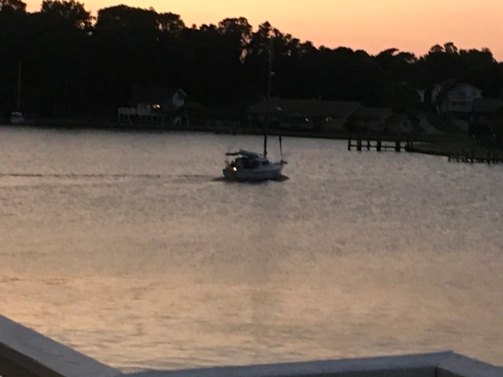 Sunset in Colington Harbour brings all of the boats back into port. Stately masted sailboats and little junkie pontoons all turn away from their day-trippy cruises and head back for the safety of secure slips and backyard docks. The ones who try to last out on the sound until the very last vestige of sunlight has slipped over the horizon have to return by the illumination of their boat’s running lights.