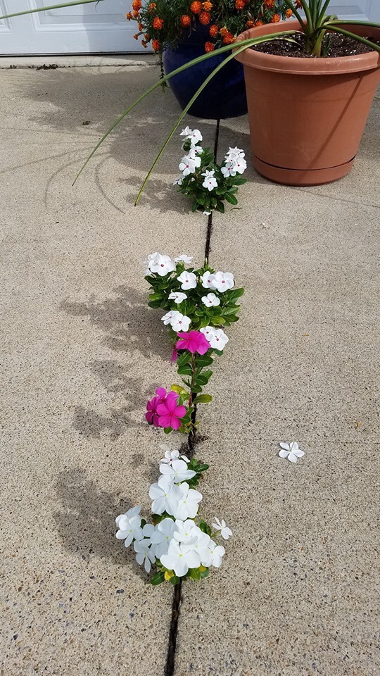 These beautiful flowers are called vinca. They delight their owner with their snowy white and Barbie pink petals. But if you look closer, you will spot the real source of amazement; they grow out of a crack in the driveway every year. These delicate beauties fight the resistance of heavy concrete and darkness, pushing through the tiny strip of dirt to emerge and display their glory. Vinca are survivor-fighters.
