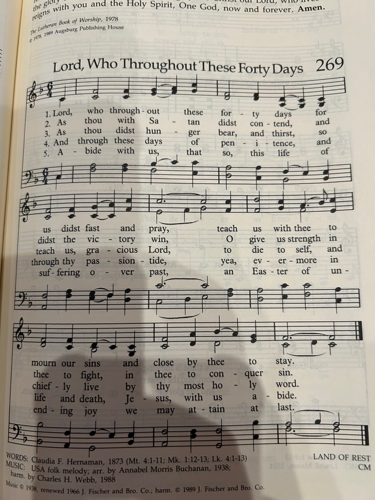 “Lord, Who Throughout These Forty Days” reminds us of the truth at the heart of Lent. Jesus fasted and prayed for us in his forty days. He calls us to mourn our sins and remain close to him. He contended with Satan in the wilderness and won that battle, enabling us to also withstand the temptation to sin. He was hungry and thirsty, setting an example for us to die to self as he did for our sake. He lived by the Word of God so that we might live by the Word. He abides with us through our penitence, our life, and our death. And thus when Lent has fulfilled its purpose, an Easter of unending joy will be ours.